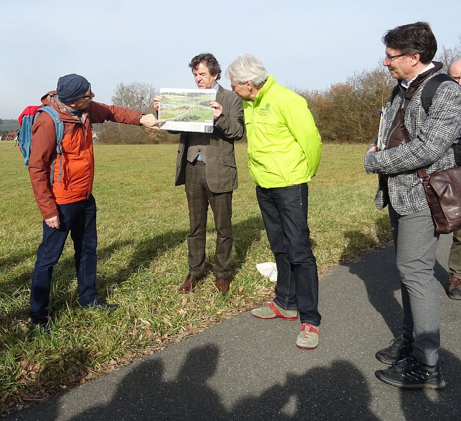 Auf dem "Eckerberg", etwas oberhalb des laut Planung mit 5 Meter in die Landschaft eingeschnittenen Kreisels, erklärt Reiner Helm, der stellvertretende Vorsitzende der Bürgerinitiative, dass entgegen den Zielen der BI die Ortsumgehung zur politisch fixen Idee geworden sei. Die Baukosten, die sich mittlerweile auf über 30 Mio. Euro Euro für 2,5 km Straße beliefen, würden nur zu Flächenfraß, Bodenversiegelung, Eingriff in Landschaft und Lebensräume sowie weiterem Verkehrslärm führen. Anja Plettke, ebenfalls Vorstandsmitglied der BI, fordert, dass eine spürbare Entlastung der Menschen vor Ort durch ökologisch sinnvolle Maßnahmen endlich in den Fokus genommen müsste.